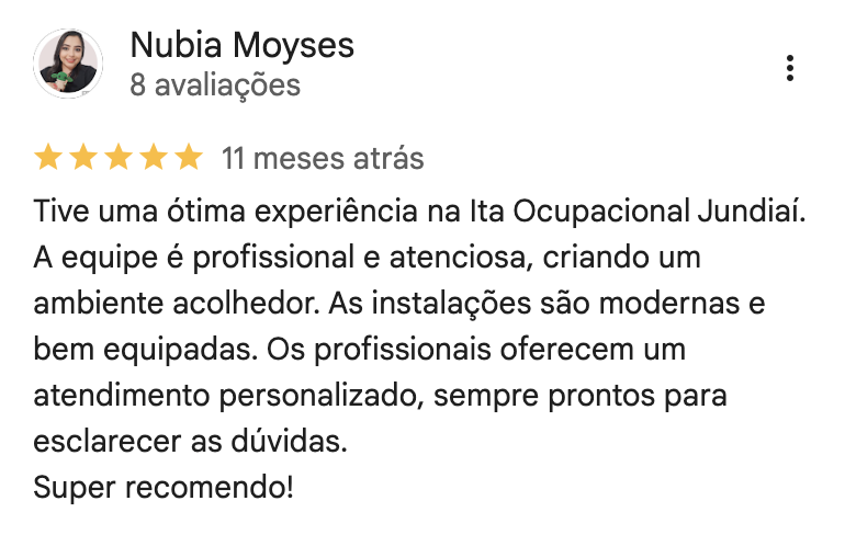 A Ita Ocupacional é reconhecida pela excelência no atendimento e pela confiança que transmite aos clientes. Confira alguns comentários de quem já passou pela nossa clínica e aprovou a experiência.